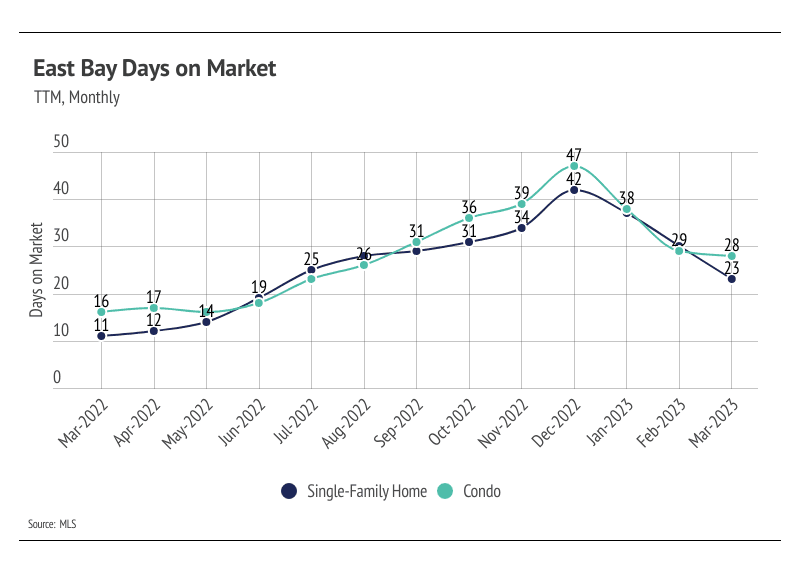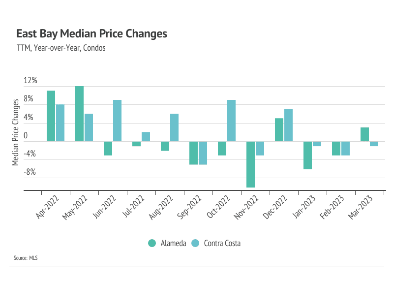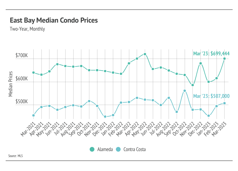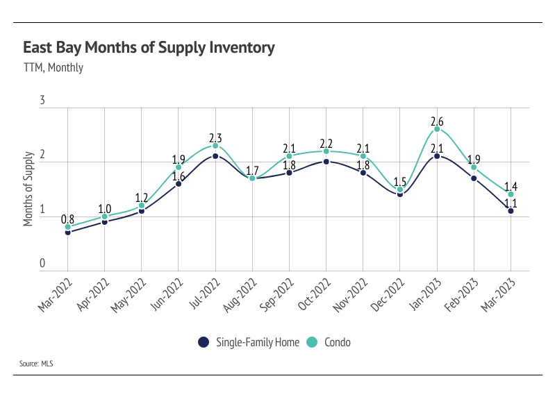 Inventory in the East Bay has increased in February and March, which is great news for buyers who are searching for their dream home. The East Bay has a strong demand for housing, and we believe that there is still room for more homes to enter the market before the supply meets the demand. As we move into the second quarter, we expect to see sales pick up even more with the influx of new listings. However, with increased demand, buyers should be prepared for competition and potentially higher prices. It's important to note that while single-family-home prices in the East Bay are still below their all-time highs, condo prices are already close to peak levels. If the supply of homes unexpectedly declines, we could see a significant increase in prices, particularly for single-family homes. We'll continue to keep a close eye on the market, and we look forward to helping buyers and sellers navigate this exciting and dynamic time in the housing market.