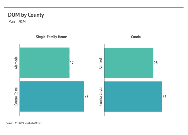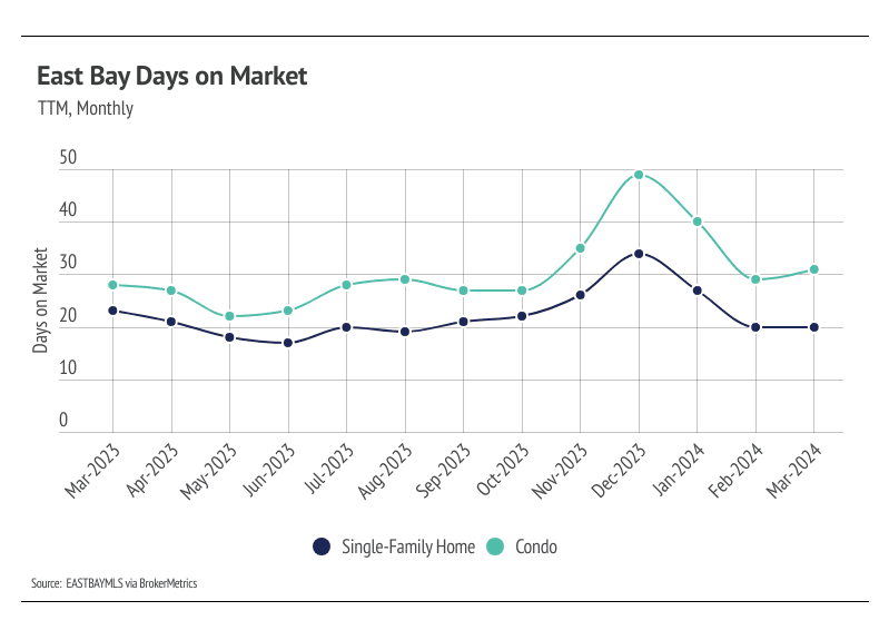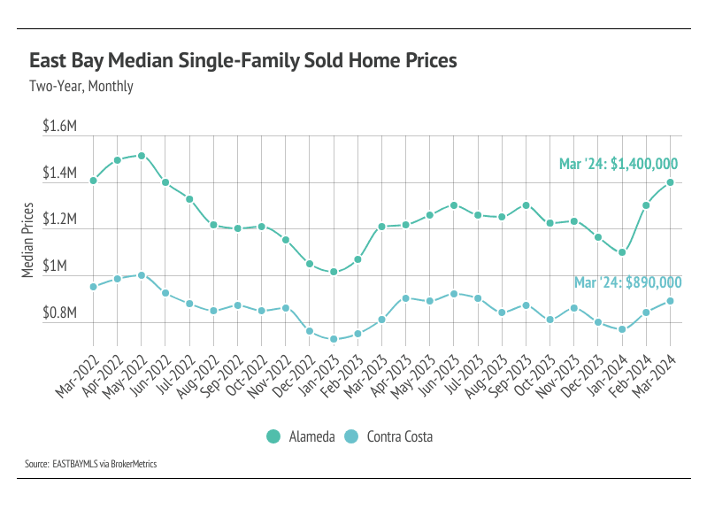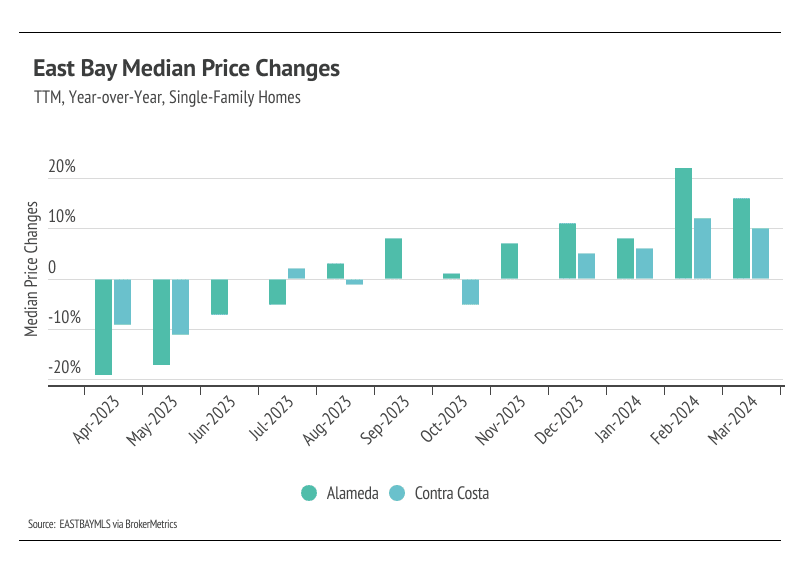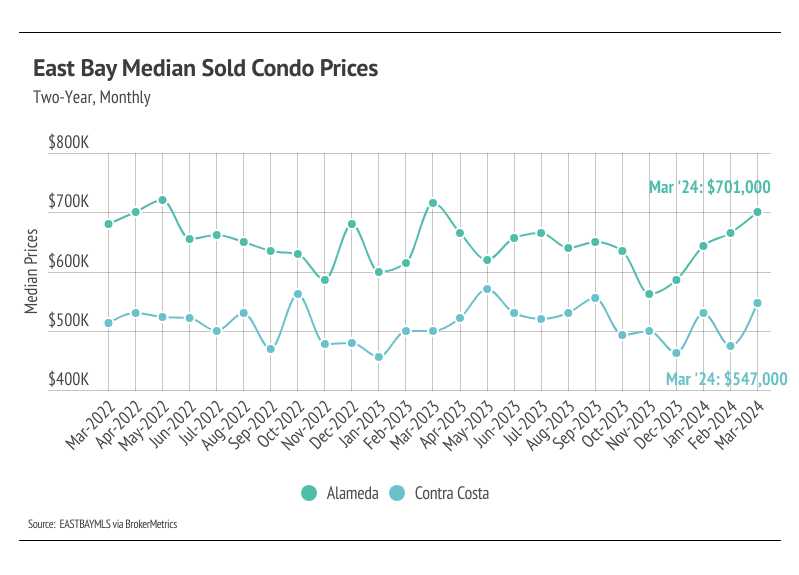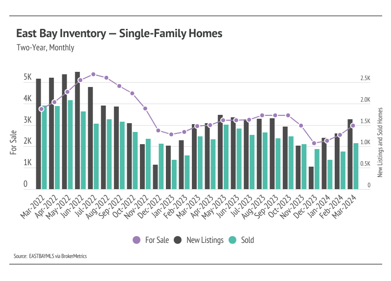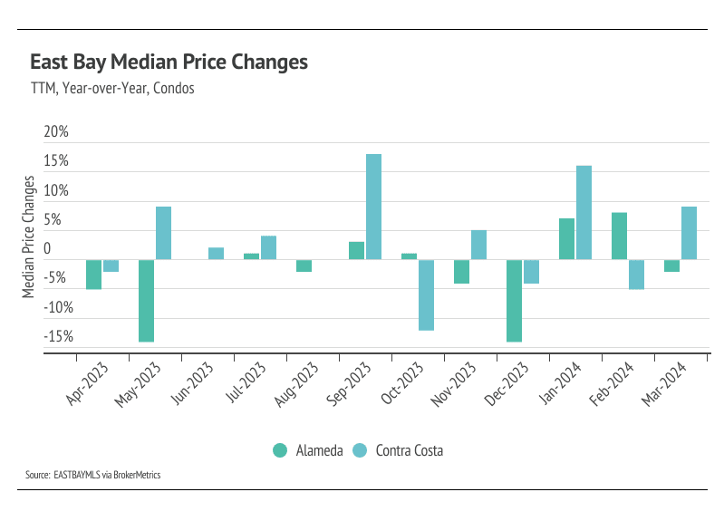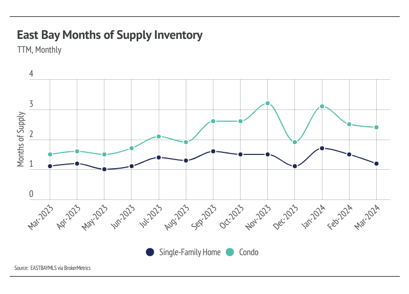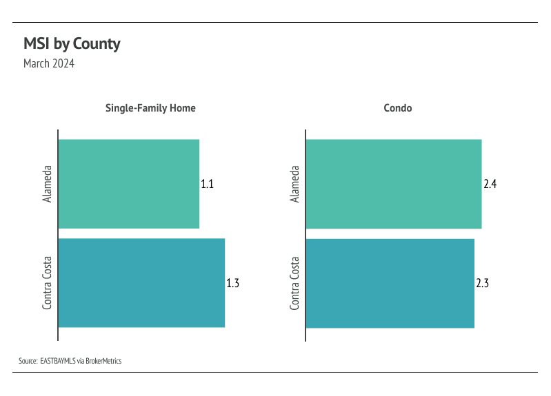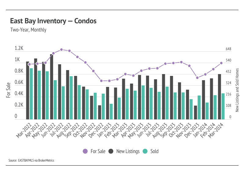 In the East Bay, low inventory and high demand have more than offset the downward price pressure from higher mortgage rates, and prices generally haven’t experienced larger drops due to higher mortgage rates. Month over month, in March, the median single-family home price rose 8% in Alameda and 6% in Contra Costa. Year over year, prices were up 16% in Alameda and 10% in Contra Costa. Condo prices were up month over month and year over year in Contra Costa, though they dropped in Alameda. We expect prices in the East Bay to remain slightly below peak until the early summer, but prices will almost certainly reach new highs in the second quarter of 2024. Low, but rising inventory only increases prices as buyers are better able to find the best match.