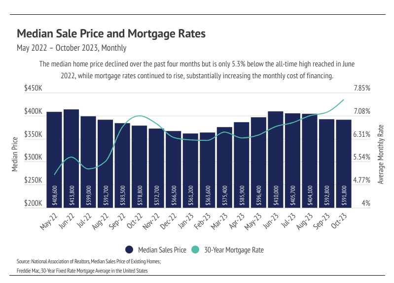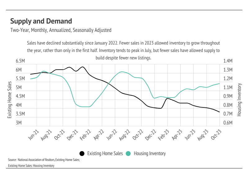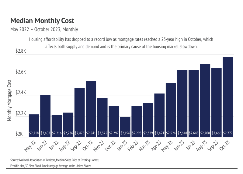 It’s hard to convey the full significance of higher mortgage rates on the housing market, but, in short, they are the primary driver of the market slowdown. This is evidenced by the fact that the market began slowing down at almost the exact same time that the Fed began its rate hikes. In October 2023, a buyer’s monthly cost reached an all-time high when accounting for the cost of financing a mortgage. Redfin reported the highest rate of buyers backing out of home purchases on record, as home buyers experienced sticker shock at the cost of financing the home. It should come as no surprise that sales continued to fall and will likely continue to decline through the winter months.