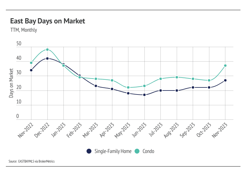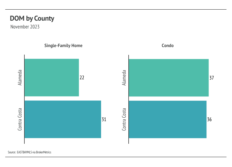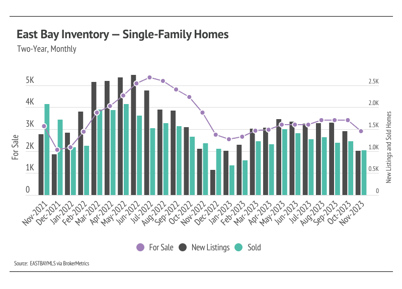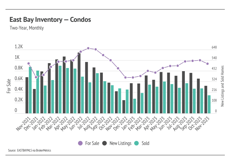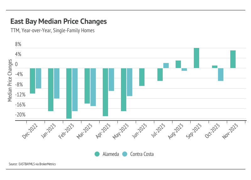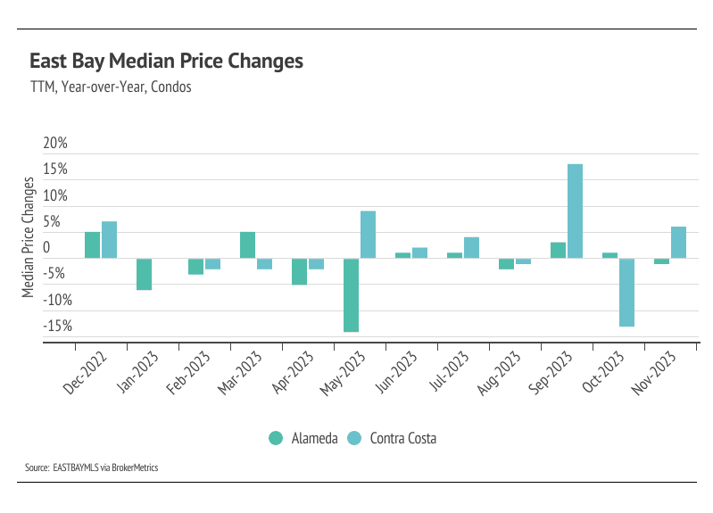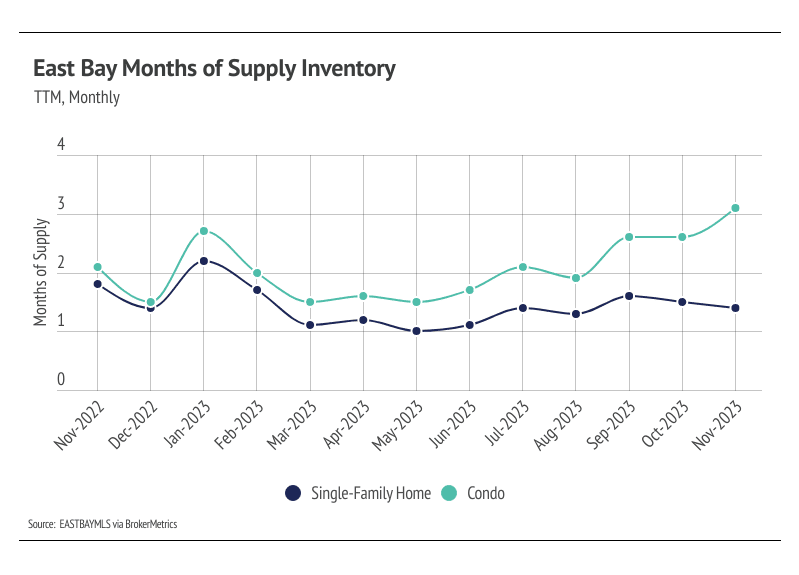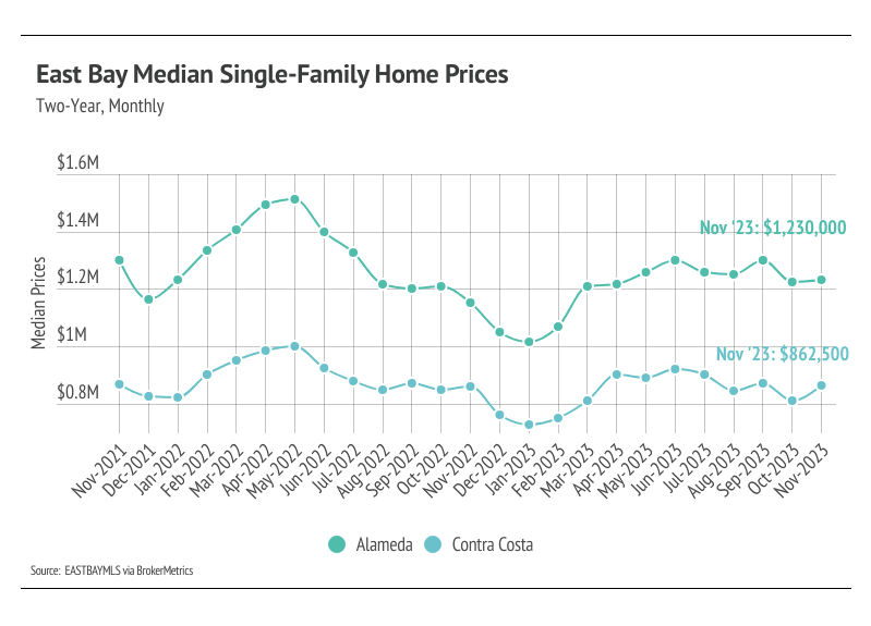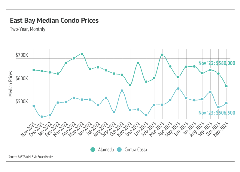 In the East Bay, home prices haven’t been largely affected by rising mortgage rates after the initial period of price correction from May 2022 to January 2023. Month over month, in November, the median single-family home price rose 0.4% in Alameda and 6.2% in Contra Costa. Condo prices were more mixed, with a 9.6% decline in Alameda and a 3.1% gain in Contra Costa. We expect prices to remain fairly stable in the winter months, but as interest rates decline and more sellers come to the market, prices will almost certainly rise in the first half of 2024. More homes must come to the market in the spring and summer to get anything close to a healthy market.