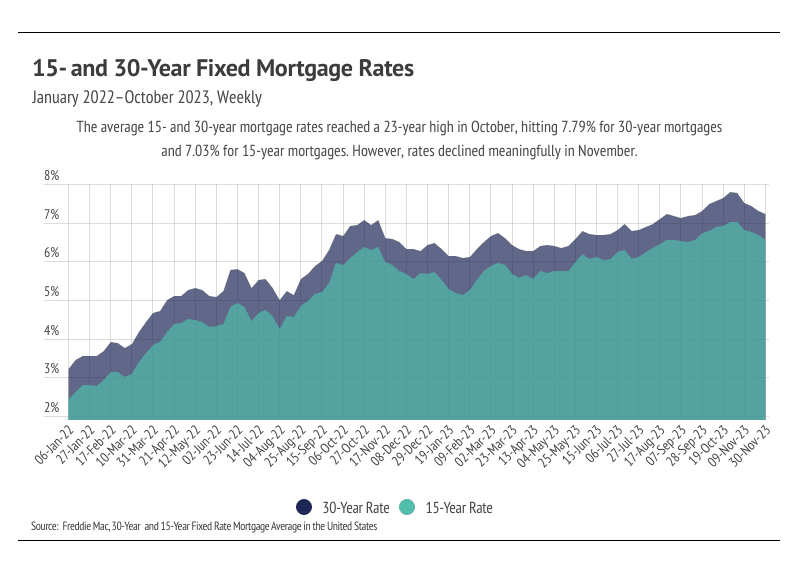 As a quick recap, the Fed dropped the fed funds rate effectively to 0% at the start of the pandemic and purchased mortgage-backed securities. The already historically low average 30-year mortgage rate then fell even further, reaching a record low of 2.65% in early 2021, which fueled the housing boom from June 2020 to June 2022. Inflation spiked in 2021, hitting levels not seen since the early 1980s and causing the Fed to begin rate hikes in March 2022, which trickled through markets quickly. From the beginning to the end of 2022, mortgage rates more than doubled, ending the white-hot housing market and creating the slow-paced 2023 market. Mortgage rates continued to rise in 2023, hitting a 23-year high of 7.79% in October. Luckily, the average 30-year mortgage rate contracted in November 2023, falling to 7.22% by the end of the month.