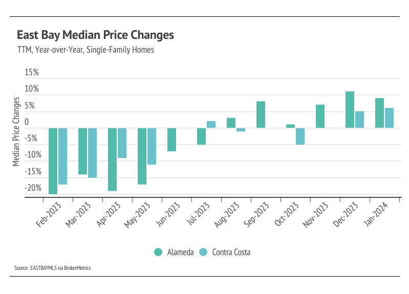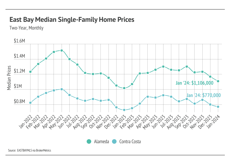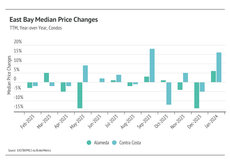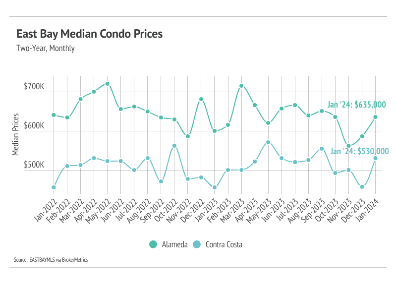 In the East Bay, low inventory has more than offset the downward price pressure from higher mortgage rates, and prices generally haven’t experienced larger price drops from higher mortgage rates. Month over month, in January, the median single-family home price fell 5% in Alameda and 4% in Contra Costa. However, year over year, prices were up 9% in Alameda and 6% in Contra Costa. Condo prices were up across the East Bay both month over month and year over year. We expect prices in the East Bay to remain below peak in the winter months, but as interest rates decline, prices could easily reach new highs in 2024 with the exception of single-family homes in Alameda, where prices are far below peak.