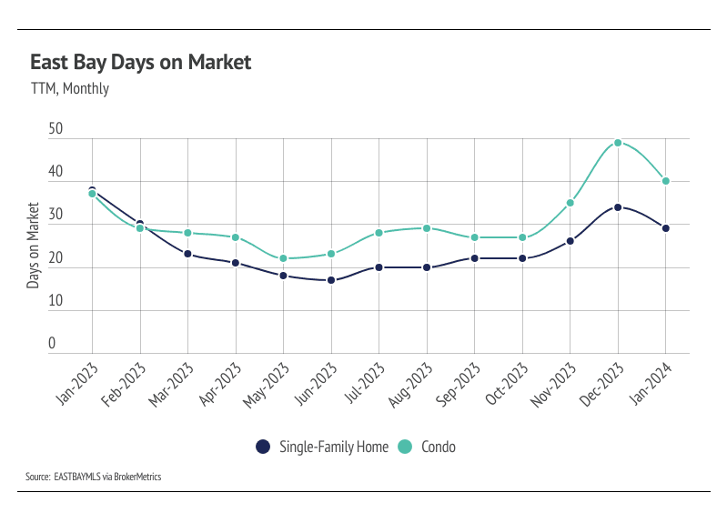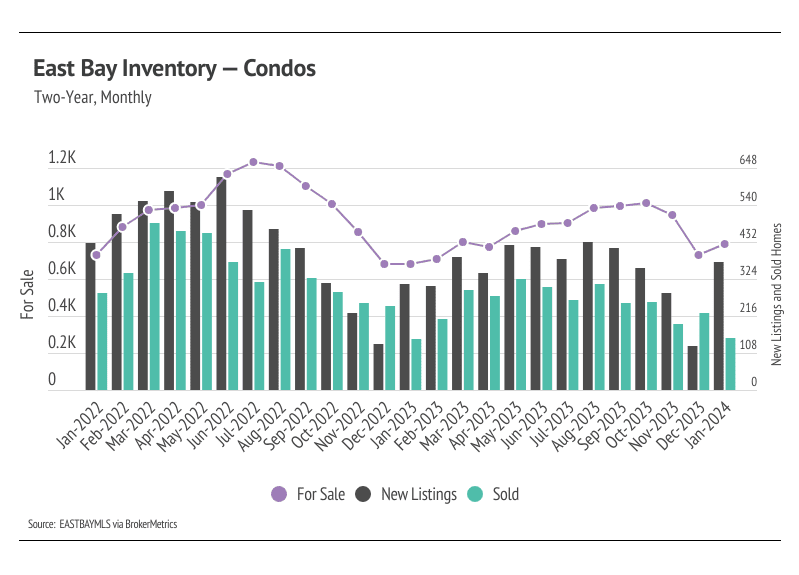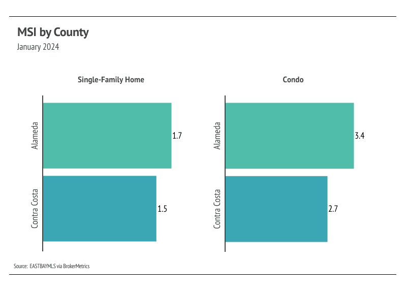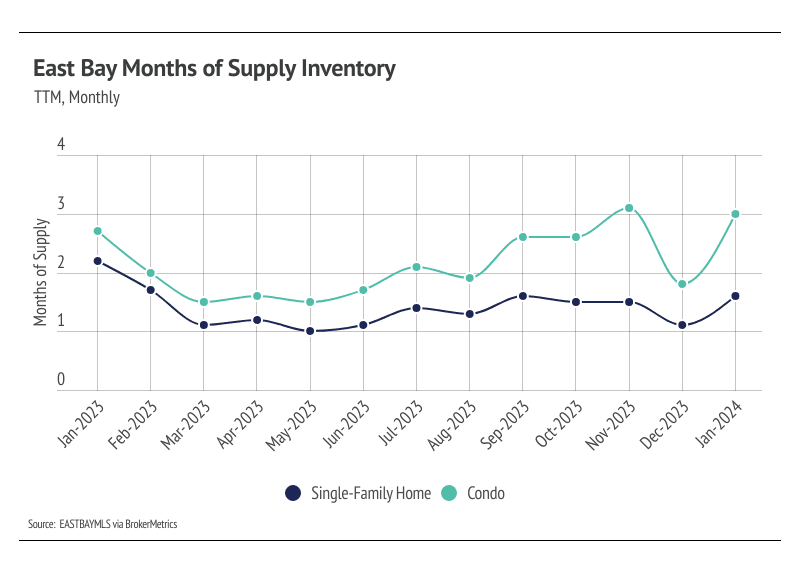 Months of Supply Inventory (MSI) quantifies the supply/demand relationship by measuring how many months it would take for all current homes listed on the market to sell at the current rate of sales. The long-term average MSI is around three months in California, which indicates a balanced market. An MSI lower than three indicates that there are more buyers than sellers on the market (meaning it’s a sellers’ market), while a higher MSI indicates there are more sellers than buyers (meaning it’s a buyers’ market). The East Bay market tends to favor sellers, which is reflected in its low MSI. MSI fell sharply in the first quarter of 2023 before gently trending higher from May to November. In December, MSI declined sharply, but rose again in January. Currently, the East Bay market favors sellers for single-family homes and is more balanced for condos.