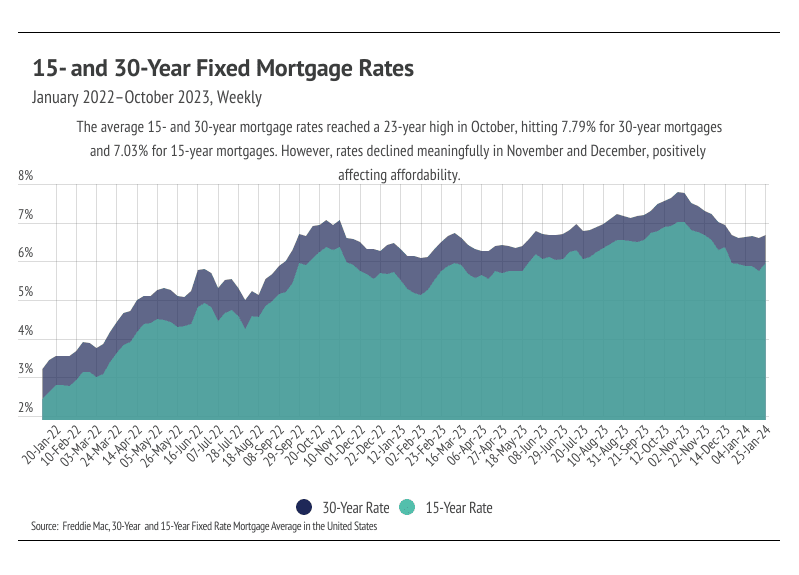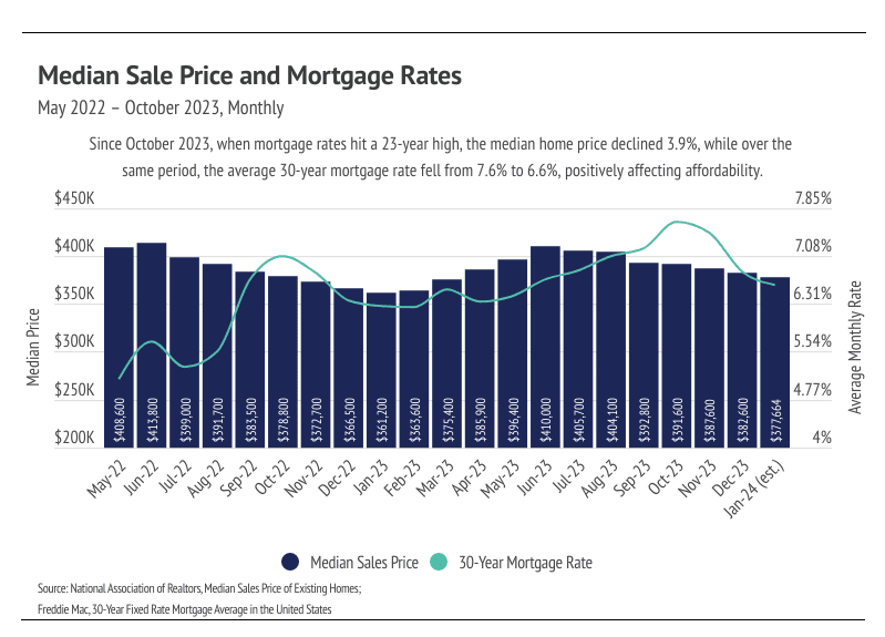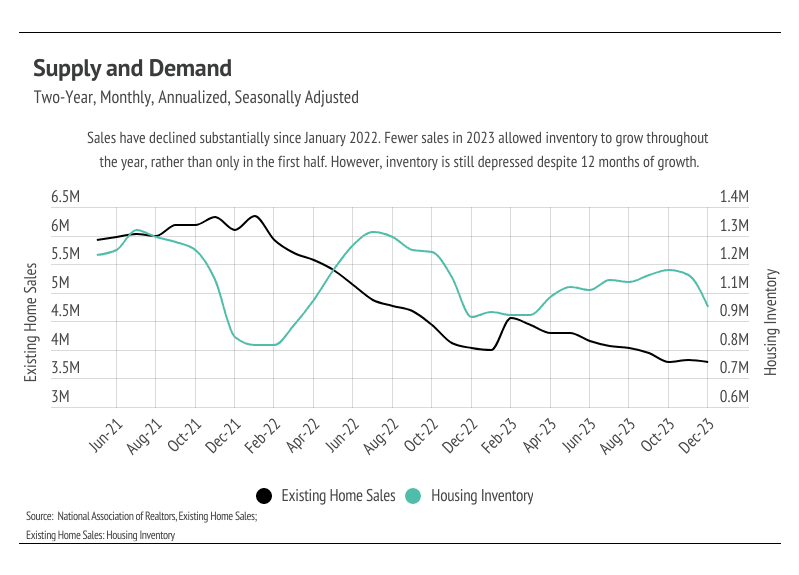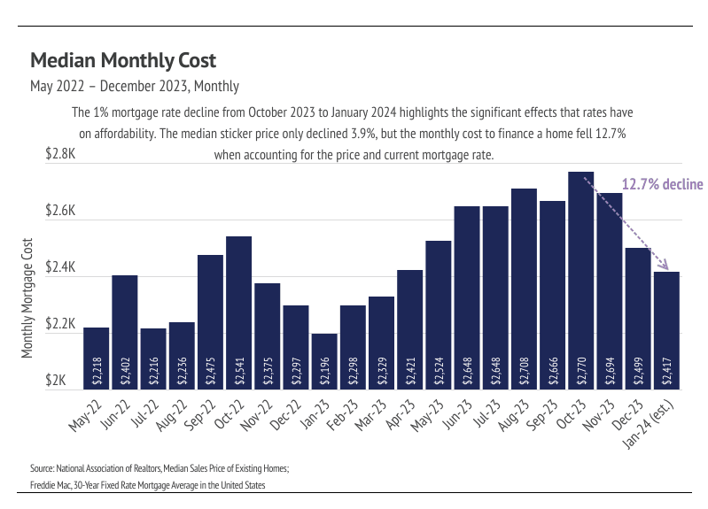 After the sharp mortgage rate drop in November and December 2023, the housing market saw real potential to warm considerably in Q1 2024, but now we expect a slower route to a healthier market. Mortgage rates remained steady at around 6.5% in January 2024, which is still about 1% higher than needed to get more participants to enter the housing market. We know the large mortgage rate drop from the 23-year high of 7.79% in October to around 6.5% wasn’t large enough to bring buyers and sellers back to the market, because the data now show that they didn’t come back. Sales reached a historic low, the number of new listings coming to market are near all-time lows, and inventory declined. This is due, in part, to normal seasonal trends — winter is when all those metrics tend to reach a seasonal bottom — but seasonality doesn’t fully explain those drops in the context of a substantial decline in rates. From October 2023 to January 2024, the monthly cost of financing a median priced home decreased nearly 13%, and the market still slowed on both the buyer and seller sides of the market, implying that rates are still too high for most would-be participants. However, we believe that if rates fall another percentage point, which roughly equates to another 10% decrease in monthly financing costs, the market will react positively and price more people into the housing market.