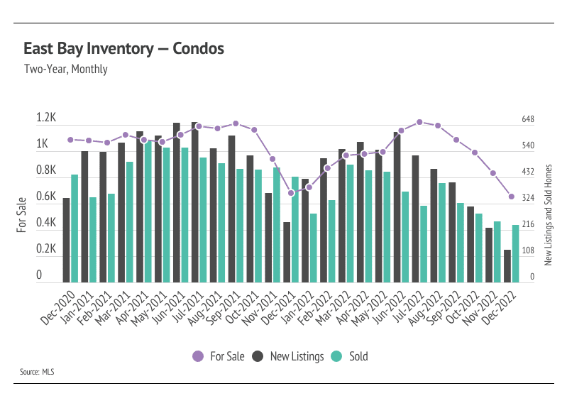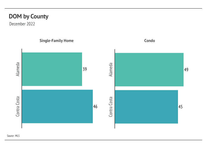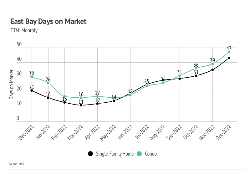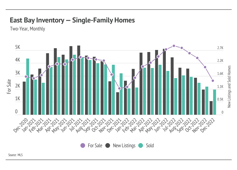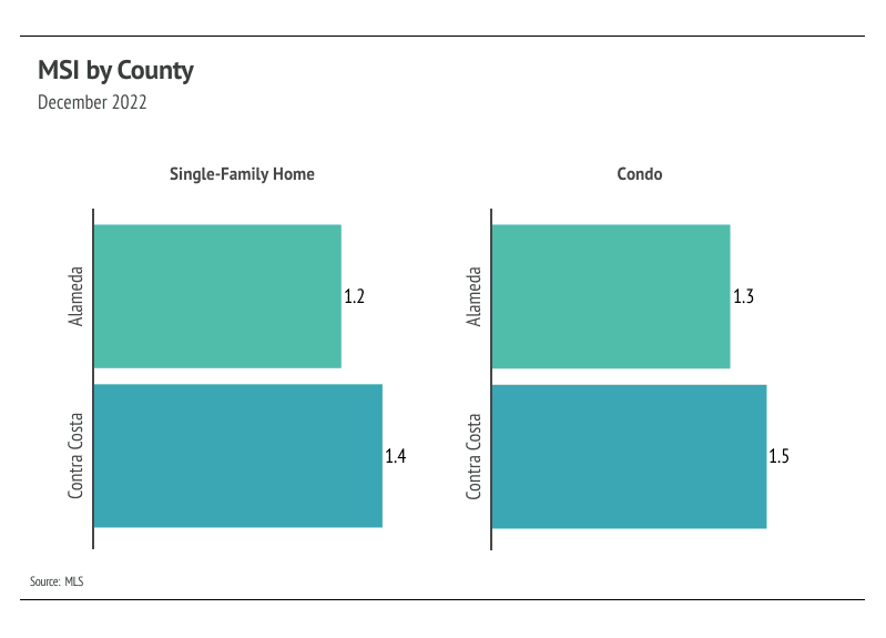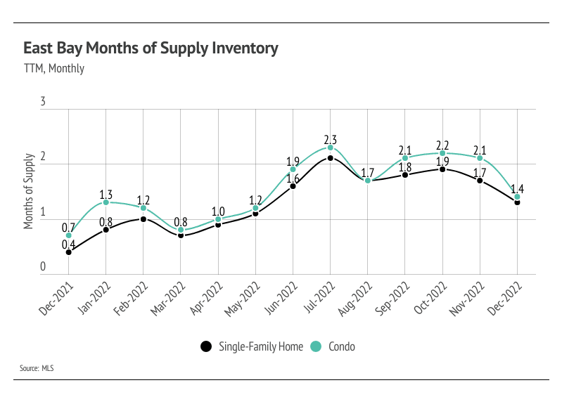 Months of Supply Inventory (MSI) quantifies the supply/demand relationship by measuring how many months it would take for all current homes listed on the market to sell at the current rate of sales. The long-term average MSI is around three months in California, which indicates a balanced market. An MSI lower than three indicates that there are more buyers than sellers on the market (meaning it’s a sellers’ market), while a higher MSI indicates there are more sellers than buyers (meaning it’s a buyers’ market). MSI has trended higher since spring 2022 but leveled out near two months of supply before reversing, indicating the East Bay is still in a sellers’ market. Despite the changing economic environment, we are comfortable saying that the market will still favor sellers for at least the first quarter of 2023.