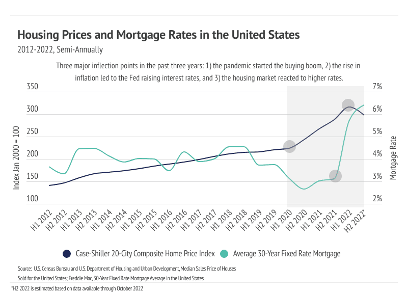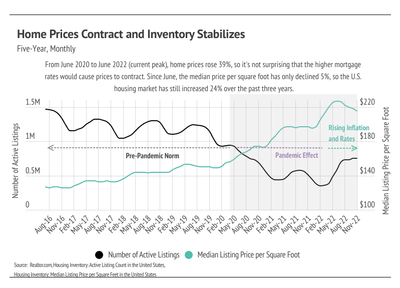 The economic factors are mixed, suggesting that the market is balancing out. Demand had nowhere to go but down after the rise in interest rates and the buying frenzy between 2020 and 2021. (The average homeowner stays in their home for about eight years.) The supply of homes is still about 20% below pre-pandemic levels, so the drop in demand brought the market closer to balance. In 2023, we expect a return to seasonal trends — price and inventory growth in the first half of the year and contraction in the back half — but at relatively lower levels, meaning fewer new listings and fewer sales overall.