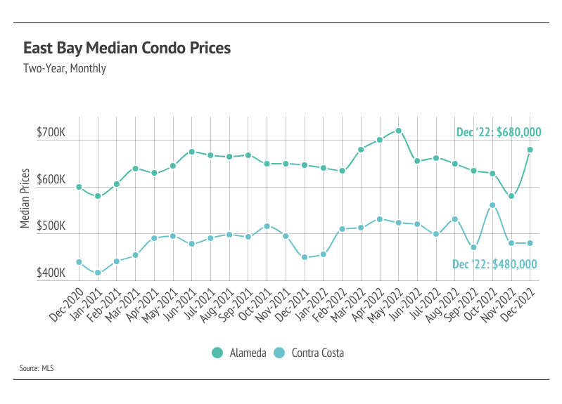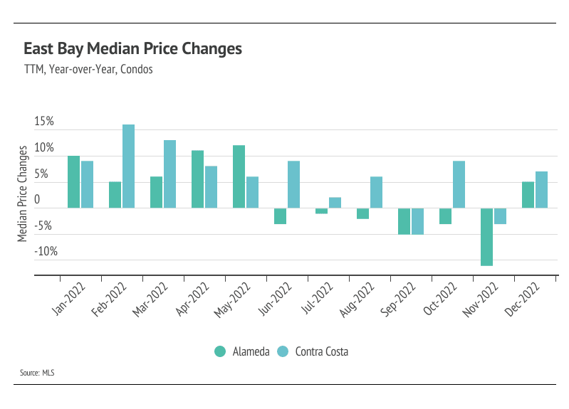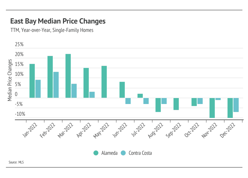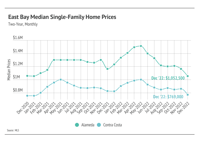 As we mentioned in the Big Story, the market has cooled for both buyers and sellers, largely because of higher interest rates. As we enter the new year, the market feels familiar — but from the era before 2020. Demand in the East Bay is evergreen, so we aren’t worried about matching buyers and sellers. That said, sellers likely won’t be getting multiple offers the second the home hits the market again anytime soon. To make a long story short, there is definitely less stress on the buying side of the market. Prices will most likely increase in 2023, but at a more modest rate of around 5-6%, which makes for a much healthier market than the volatile price movements that occurred over the past three years. Single-family home prices contracted in the second half of 2022, landing near 2020 prices in Alameda and Contra Costa, while condo prices have maintained some of their price gains. When we look back further to Q4 2019, single-family home prices have increased 27% in Alameda and Contra Costa, and condo prices have risen 10% in Alameda and 17% in Contra Costa. Without any signs of interest rates dropping, we’re entering a stage of slower, longer-term growth.