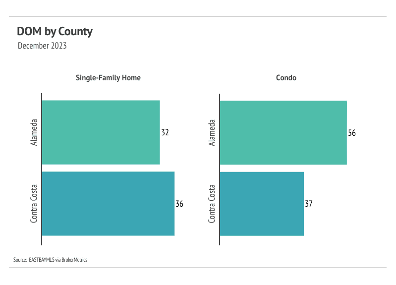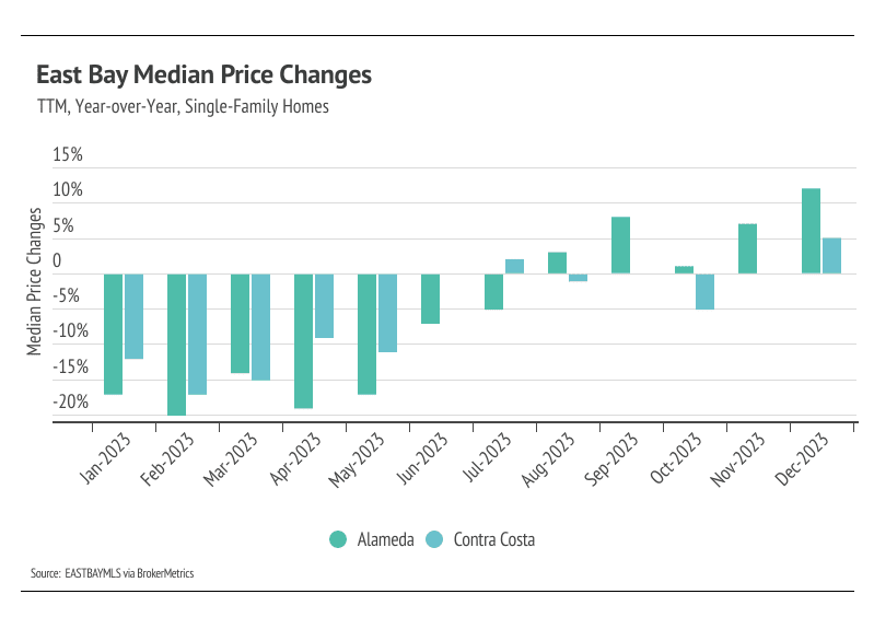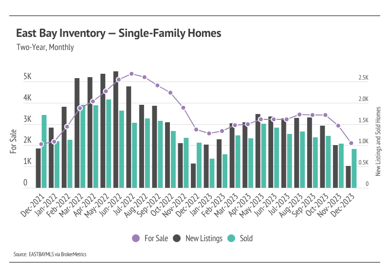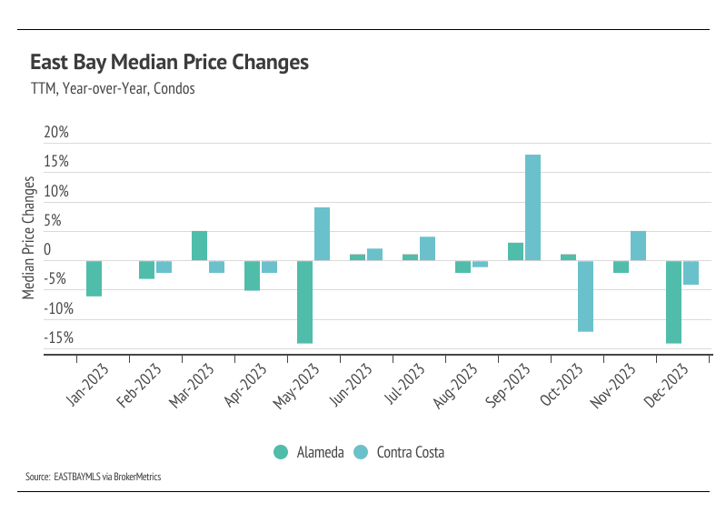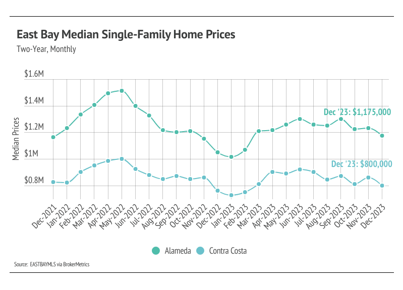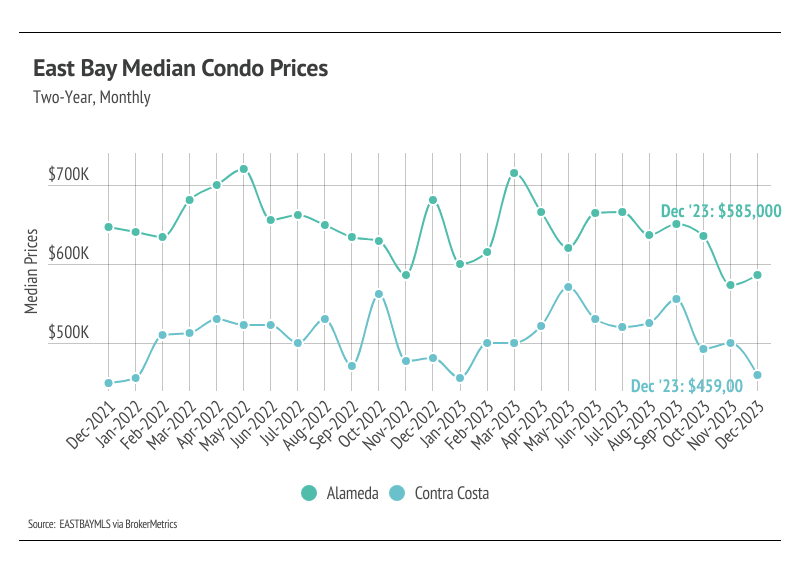 In the East Bay, home prices haven’t been largely affected by rising mortgage rates after the initial period of price correction from May 2022 to January 2023. Month over month, in December, the median single-family home price declined 4.5% in Alameda and 7.0% in Contra Costa. Condo prices were more mixed, with a 2.1% increase in Alameda and an 8.6% decrease in Contra Costa. We expect prices to remain fairly stable in the winter months, but as interest rates decline and more sellers come to the market, prices will almost certainly rise in the first half of 2024. More homes must come to the market in the spring and summer to get anything close to a healthy market.