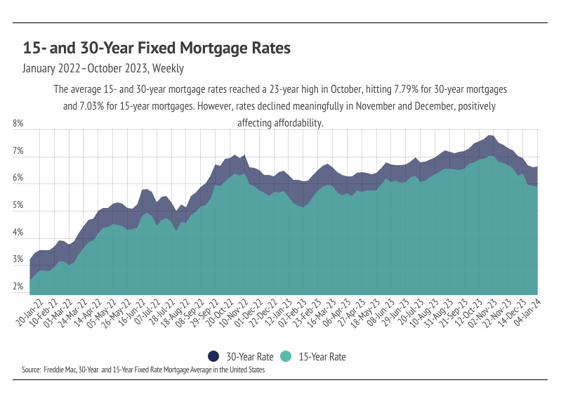 In any case, for the >70% of homebuyers who finance their purchases with mortgages, rate cuts are very good news, as shown by the month-over-month increase in sales. However, even before the December meeting, economic indicators seemed favorable for rate cuts, which, in part, caused mortgage rates to drop 0.57% in November 2023 — a significant fall from the 23-year high of 7.79% in October. Markets move a lot faster than the Fed, and the 1.18% mortgage rate drop in November and December brings to mind the trends we saw in the first quarter of 2022. In December 2021, Fed Chair Jerome Powell stated that they were increasing rates beginning in March 2022, but mortgage rates increased by about a point in the first quarter even before the Fed made any changes.