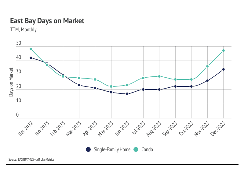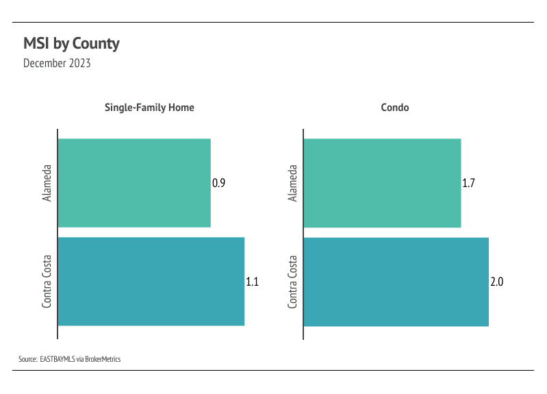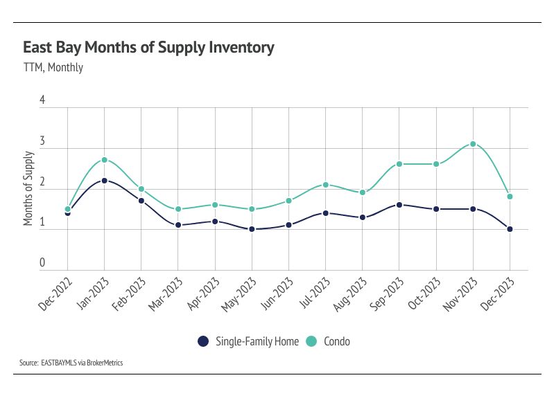 Months of Supply Inventory (MSI) quantifies the supply/demand relationship by measuring how many months it would take for all current homes listed on the market to sell at the current rate of sales. The long-term average MSI is around three months in California, which indicates a balanced market. An MSI lower than three indicates that there are more buyers than sellers on the market (meaning it’s a sellers’ market), while a higher MSI indicates there are more sellers than buyers (meaning it’s a buyers’ market). The East Bay market tends to favor sellers, which is reflected in its low MSI. MSI fell sharply in the first quarter of 2023 before gently trending higher from May to November. In December, MSI declined sharply. Currently, the East Bay housing market favors sellers.