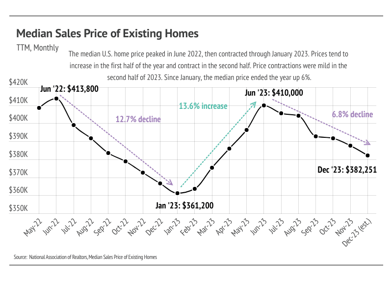 As demand slows, buyers are gaining more negotiating power and paying less than they were during the busier summer season. In June 2023, the average seller received 105% of list price, compared to 101% of list in December. However, on average, buyers paid 4% more in December 2023 than December 2022. Inventory will almost certainly remain historically low for the next few months, and buyer competition will ramp up meaningfully in the spring, which will drive price appreciation.