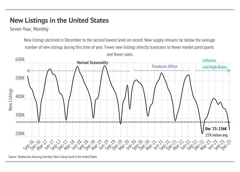 Single-family home and condo inventory barely increased at all last year, which is far from the seasonal norm. In 2023, inventory didn’t have anything resembling the typical sine wave, since far fewer sellers came to the market, especially in the first half of the year, and the low inventory and fewer new listings slowed the market considerably. New listings have been exceptionally low, so the little inventory growth last year was driven by softening demand. Typically, inventory peaks in July or August and declines through December or January. However, in 2023, inventory peaked in October, further highlighting the atypical supply trend. In November and December, inventory, sales, and new listings dropped, which is normal this time of year. With the current low inventory levels, the number of new listings coming to market is a significant predictor of sales. Month over month, new listings fell 50% and sales declined 8%. Total inventory is down 18% year over year.