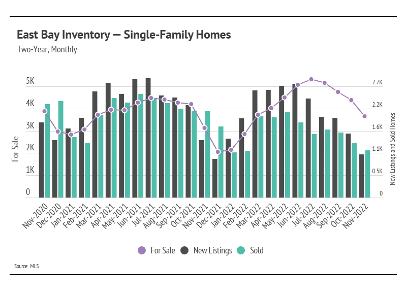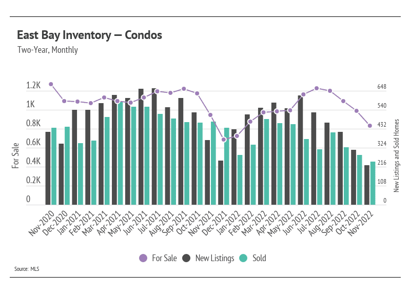 The East Bay, along with the rest of the country, has not returned to anywhere near pre-pandemic inventory levels after the buying boom last year. However, we were happy to see more single-family home inventory come to market, which drove a meaningful increase in inventory this year. Condo inventory failed to grow. We can compare condo sales and new listings from 2021 to 2022 to see the effects of fewer homes coming to market. Fewer homes and the rising rate environment have dropped demand.