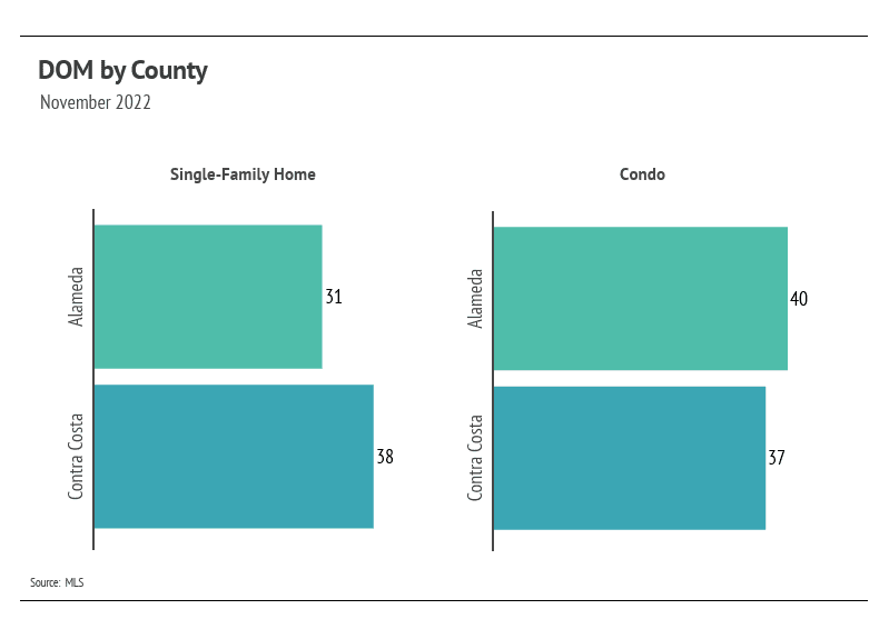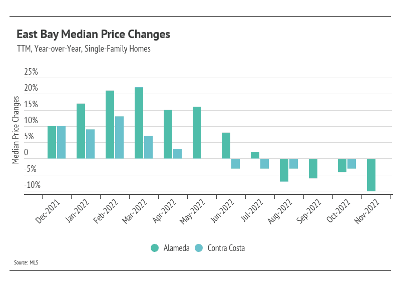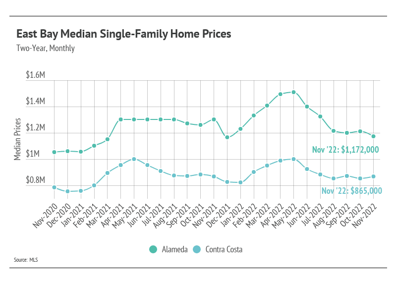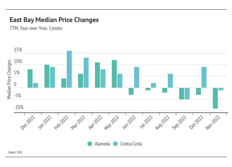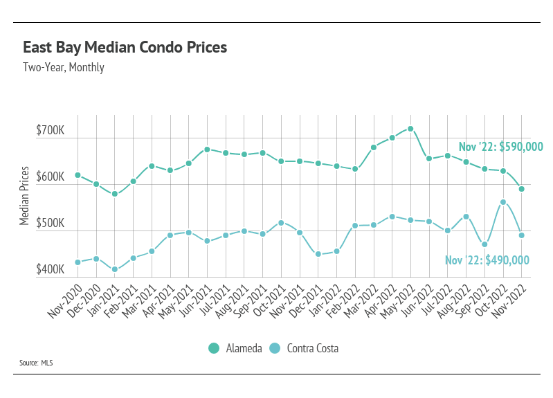 As we mentioned in the Big Story, the market is cooling on both the buy and the sell sides. When there are fewer sellers, there are also fewer buyers, because some buyers are selling their homes to move to others in the same market. New listings have declined faster than sales, causing inventory to decline near the all-time low level we experienced last winter. However, the key difference is that fewer buyers are on the market — so, even with low inventory, buyers can still find the home that’s right for them. The low inventory has insulated prices from a major reversal. Although prices have contracted, they have maintained price gains over the past 24 months with the exception of Alameda condos, which are now lower than in November 2020..