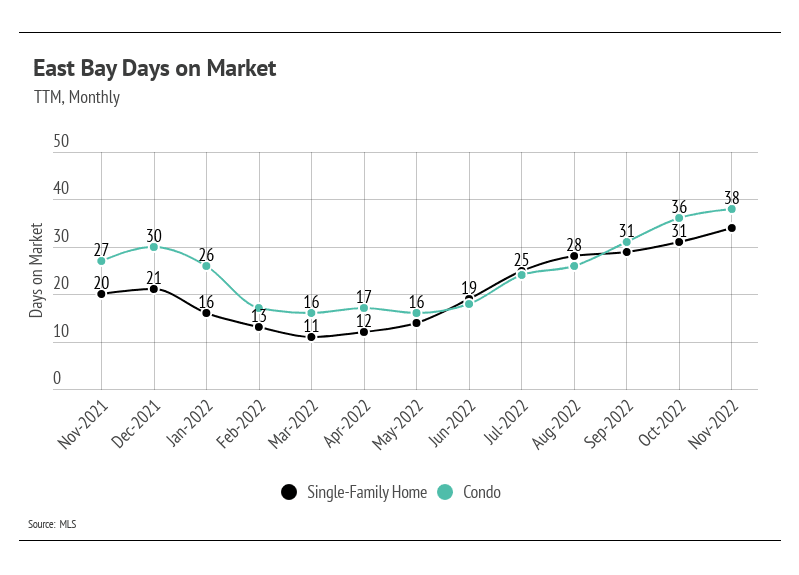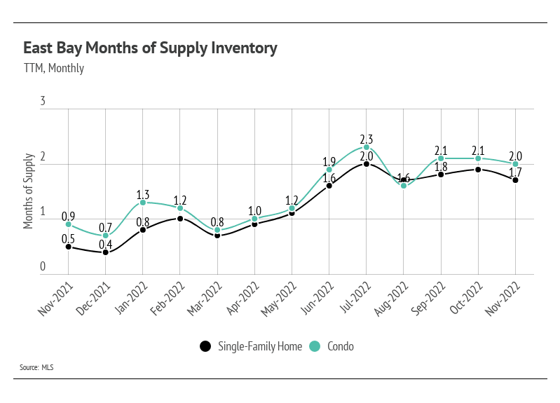 Months of Supply Inventory (MSI) quantifies the supply/demand relationship by measuring how many months it would take for all current homes listed on the market to sell at the current rate of sales. The long-term average MSI is around three months in California, which indicates a balanced market. An MSI lower than three indicates that there are more buyers than sellers on the market (meaning it’s a sellers’ market), while a higher MSI indicates there are more sellers than buyers (meaning it’s a buyers’ market). MSI has trended higher (from a sellers’ market toward balance) since late spring, but despite the changing market environment, the East Bay is still in a sellers’ market for single-family homes and condos.