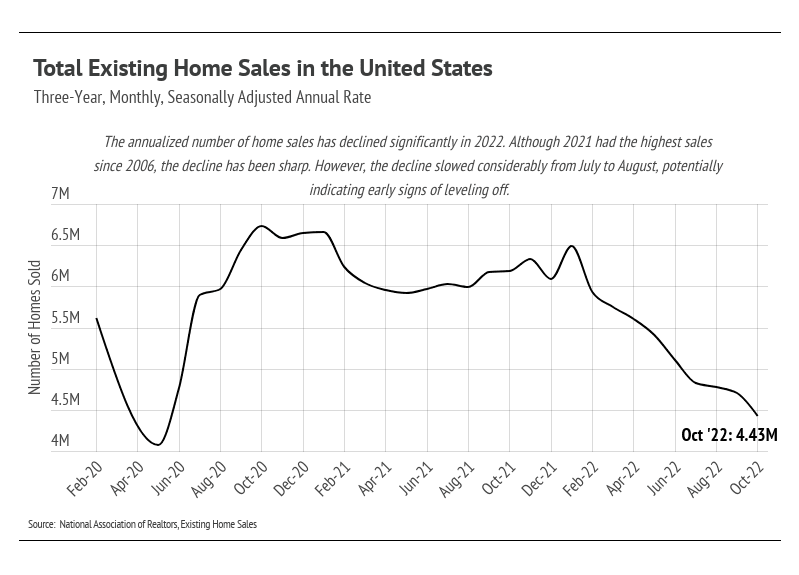 Competition for homes typically softens during the winter months because people focus on the holidays and tend to be less active because of the colder weather and shorter daylight hours. Add in 15- to 20-year-high mortgage rates, prices still near record highs, high inflation, and worries over a recession, and let’s say the competition over homes tends to decline further. This year, sales have dropped every month since January according to the National Association of Realtors, a 32% drop overall. If this trend continues through the rest of the year (current data ends October 2022), which it almost certainly will, 2022 will have about a million fewer sales than 2021. Of course, 2021 had the largest number of sales since 2006, with nearly a million homes sold above the long-term average. With that in mind, it stands to reason that about a million fewer homebuyers than average would be in the market in 2022, especially when considering that financial incentives to buy ended abruptly at the start of this year. We were still surprised to see inventory rise in October after inventory appeared to peak in September.