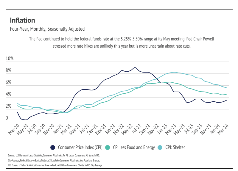 During its May meeting, the Federal Reserve unanimously decided to hold policy rates steady for the sixth consecutive time, keeping the federal funds target rate at 5.25% to 5.50%. Fed Chair Jerome Powell emphasized that future rate hikes are unlikely, and rates are expected to remain steady, with less clarity on potential cuts. The Fed's dual mandate aims for stable prices (around 2% inflation) and low unemployment. With a strong jobs market, the focus remains on inflation.