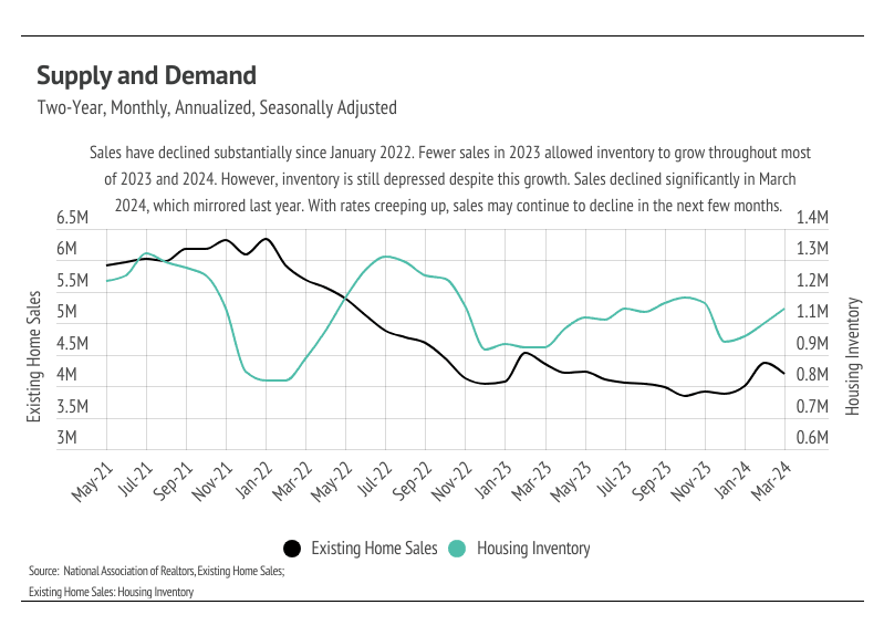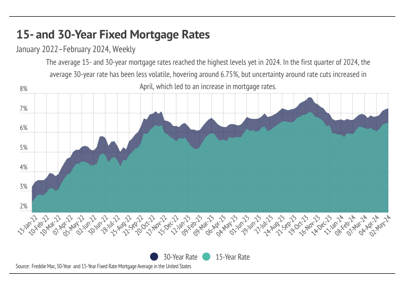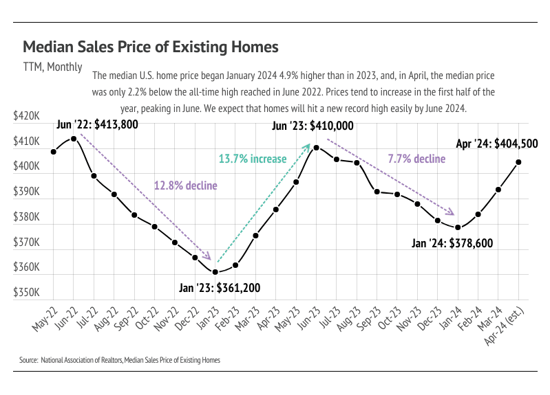 This shift has led to higher mortgage rates, which have risen 0.6% since the start of the year, with two-thirds of that increase occurring in April. Rising rates, especially rapid increases, tend to slow the housing market. As of May, the average 30-year mortgage rate hit 7.22%, the highest level in 2024 and close to last year's 23-year high of 7.79%. In April, rising prices and rates decreased affordability significantly. The 0.38 percentage point increase in mortgage rates in April alone dramatically raised monthly home costs. Combined with median price increases, the monthly cost rose 7% in April and 13% from January to April.