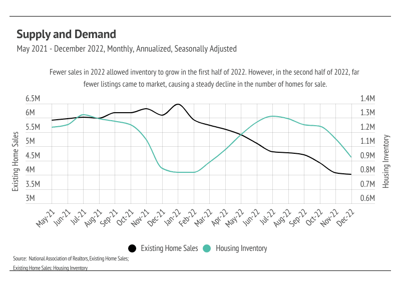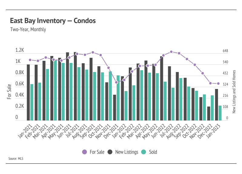 Alameda inventory fell to an all-time low level in January 2023, while the number of homes for sale in Contra Costa landed slightly above the record low reached in December 2021. Higher interest rates have dropped incentives for potential sellers and buyers to enter the market. Homeowners either bought or refinanced recently, locking in a historically low rate, so fewer listings are coming to market. Many potential buyers were priced out of the market as interest rates rose. New listings fell by 29% year-over-year, while sales declined by 41%. We still expect some inventory growth in the first half of the year, but inventory will likely remain low.