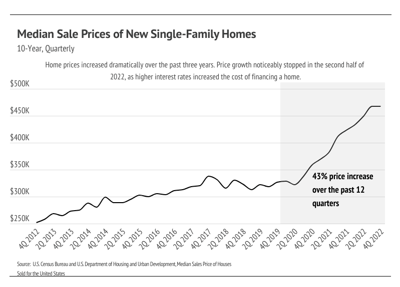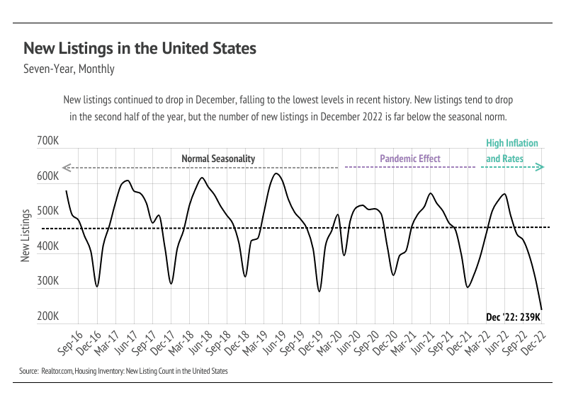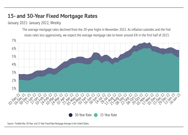 We expect mortgage rates to hover around 6% for the first half of 2023 unless the world’s faith in the United States’ ability to pay its debt obligation further erodes because of Congress’ continued delays in raising the debt ceiling. Mortgage rates are typically about 1.8% higher than 10-year U.S. Treasury bond yields, so a spike in 10-year Treasury yields also spikes mortgage rates. The current Congress certainly seems to be the most amenable to default. However, the likelihood of that happening is low, considering that the politics of a self-inflicted U.S. and global recession not seen since the Great Depression would be, objectively, outside of anyone’s best interests. Were it to happen, though, we would likely see mortgage rates easily near 8% and wealth substantially decrease, pricing many potential buyers out of the housing market.