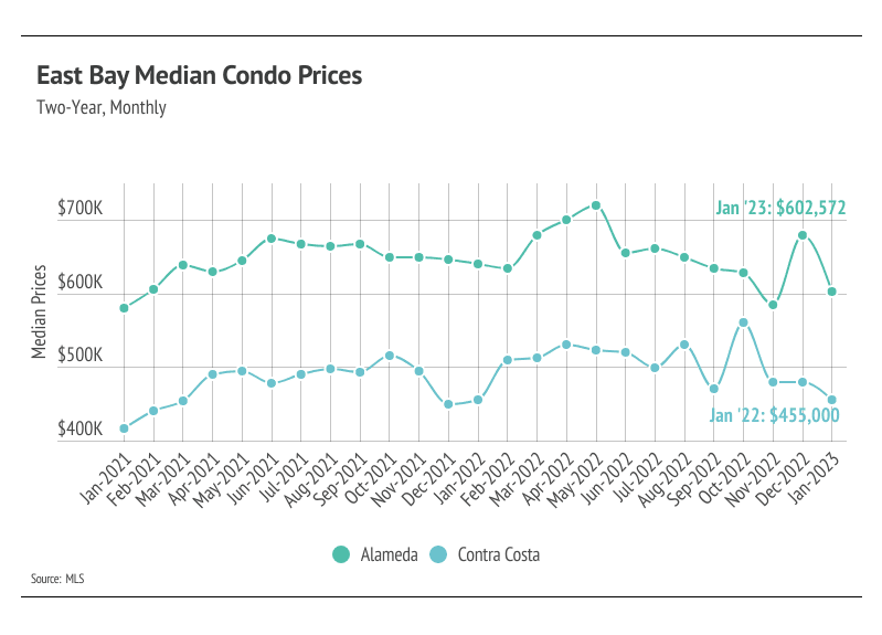 Even with the large contraction in the second half of 2022, single-family home prices increased by 19% in Alameda and 17% in Contra Costa over the past three years, while condo prices increased by 4% in Alameda and 12% in Contra Costa. It’s reasonable to assume that the market will slow after such a dramatic increase in cost, especially since it has already slowed. We’re expecting fewer sellers coming to market and fewer buyers this year.