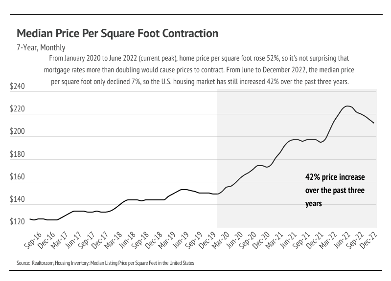 Recessions used to be defined as a fall in Gross Domestic Product (GDP) for two consecutive quarters. For what it’s worth, Real GDP in the fourth quarter of 2022 was up 1% year-over-year and 0.7% quarter-over-quarter. However, the National Bureau of Economic Research (NBER) takes a more nuanced approach by considering nonfarm payrolls, industrial production, and retail sales, among other indicators. The U.S. employment rate is still strong despite some notable high-profile companies, especially in tech, announcing mass layoffs. The unemployment rate is 3.5%, which is about as low as we’ve seen in modern history. Additionally, initial unemployment claims and continued claims have been at pre-pandemic levels for about 13 months and 11 months, respectively. Total Nonfarm Private Payroll Employment data (seasonally adjusted) from ADP shows that job growth stagnated in the second half of 2022 but didn’t decline. With over 10 million job openings in the country, the level of unemployment should remain historically low for the foreseeable future. Generally, a high employment rate is good for both the housing market and the overall economy for fairly straightforward reasons: Employed people make money, so they can pay their bills and not default on their debt.