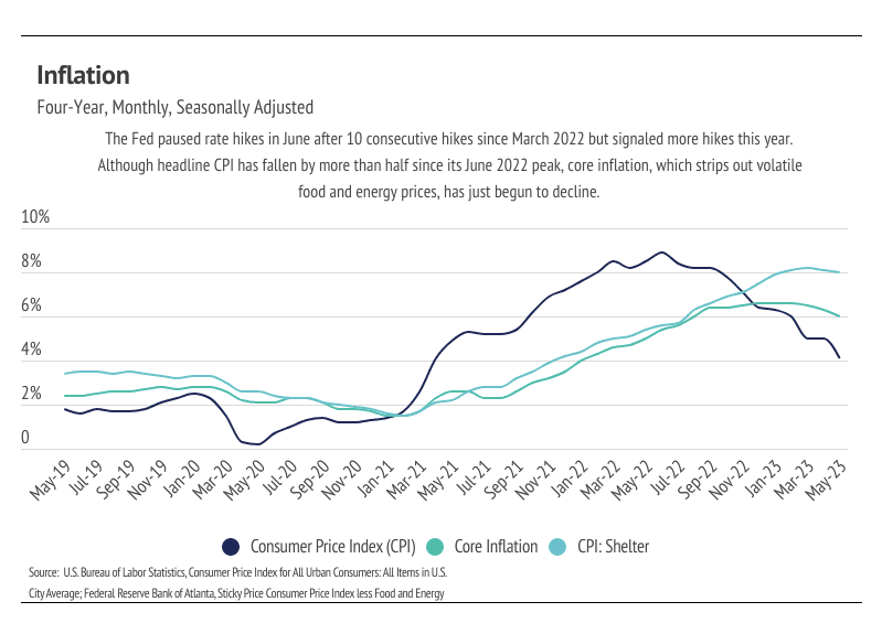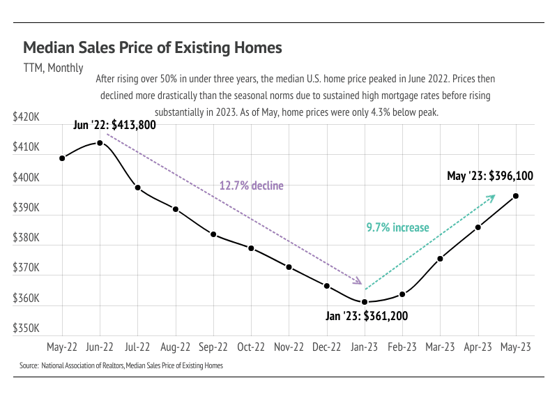 During the Fed’s June meeting, board members decided unanimously to pause rate hikes but noted that at least two more would likely occur this year. Although headline inflation (Consumer Price Index, or CPI) is down by half since it hit 9% last June, core inflation, which removes volatile food and energy prices from the inflation calculation, has barely started to fall. Core inflation peaked in December 2022 and has contracted 9%. A large component to core inflation is shelter. The Consumer Price Index for Shelter is only down 2% from the March 2023 peak. This isn’t exactly surprising. If we compare the monthly cost of financing a median-priced home with the average 30-year mortgage in December 2021 versus June 2023, the monthly cost has increased 95%.