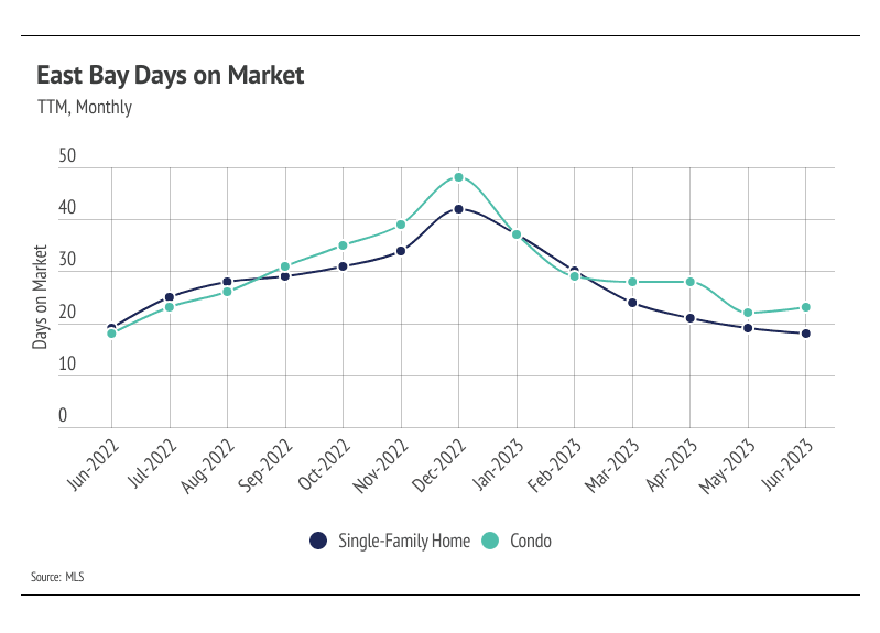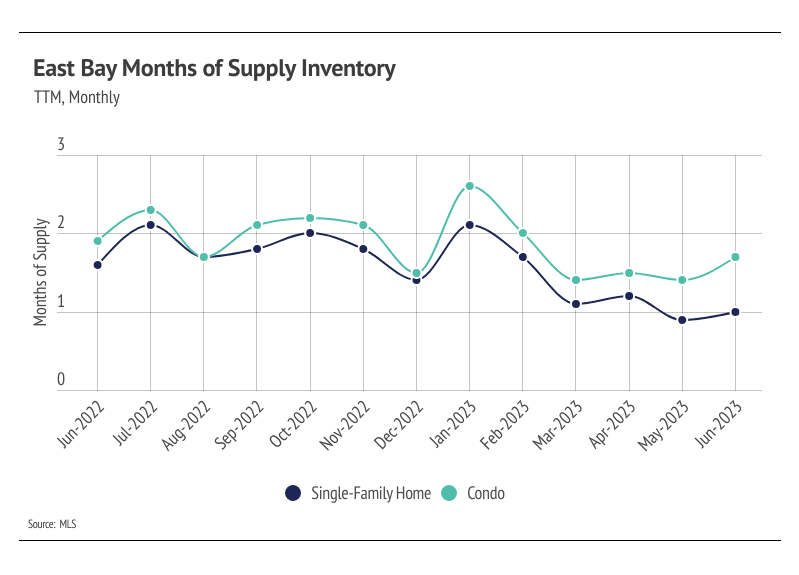 Months of Supply Inventory (MSI) quantifies the supply/demand relationship by measuring how many months it would take for all current homes listed on the market to sell at the current rate of sales. The long-term average MSI is around three months in California, which indicates a balanced market. An MSI lower than three indicates that there are more buyers than sellers on the market (meaning it’s a sellers’ market), while a higher MSI indicates there are more sellers than buyers (meaning it’s a buyers’ market). The East Bay market tends to favor sellers, which is reflected in its low MSI. MSI trended lower in the first half of the year for both single-family homes and condos, meaning the market more strongly favors sellers. The sharp drop in MSI occurred due to the higher proportion of sales relative to active listings and less time on the market.